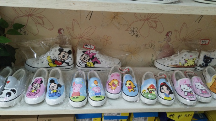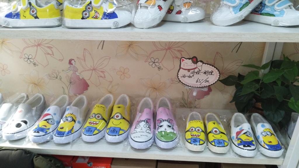 姐姐:印象比较深刻的啊,其实也都差不多,就是每年都会有很多老客户,换季就会来给大人小孩买鞋。比较有创意的作品啊,其实要求定做的人,都挺有创意的,画风景的,画卡通人物的,还有抽象派的,要求画什么都有。