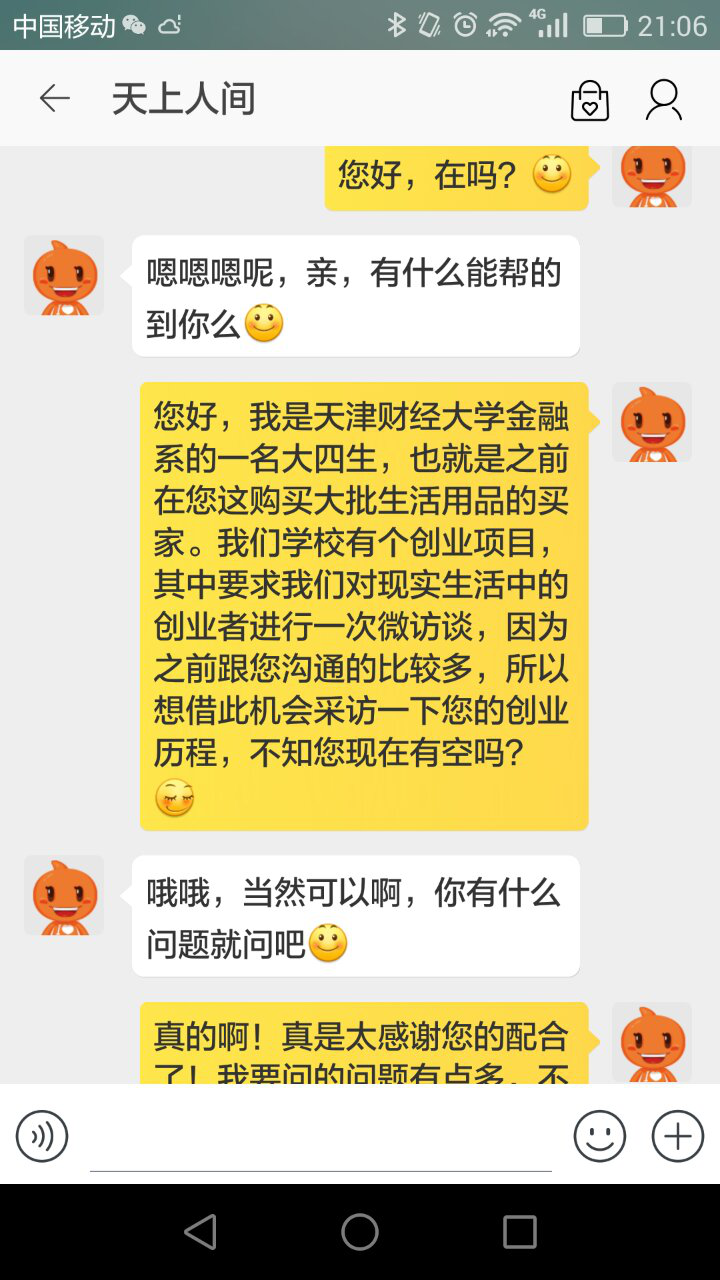 朱明侠22:您好,我是天津财经大学金融系的一名大四在校生,也就是之前在您这购买大批生活用品的买家。我们学校有个创业项目,其中要求我们对现实生活中的创业者进行一次微访谈,因为之前跟您沟通的比较多,所以想借此机会采访一下您的创业历程,不知您有没有时间。