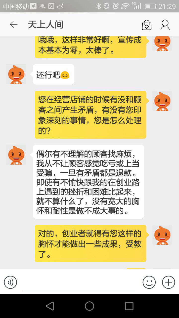 天上人间:偶尔有不理解的顾客找麻烦,我从不让顾客感觉吃亏或上当受骗,一旦有矛盾都是退款。即使有不愉快 跟我的在创业路上遇到的挫折和困难比起来,就不算什么了,没有宽大的胸怀和耐性是做不成大事的。